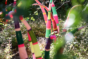 Die „Ruhrorter Strickguerilla“ präsentierte gestrickte Tierchen in Industrienatur und ergänzte natürlichen mit gestricktem Wildwuchs als Ausdruck von gelebter Artenvielfalt.
